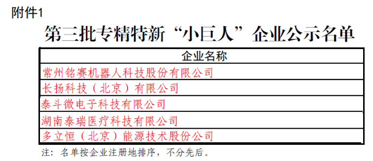 7月27日,工業(yè)和信息化部公布了第三批專精特新“小巨人”企業(yè)名單并完成了社會公示。合創(chuàng)資本共計5家被投企業(yè)成功入選,分別是常州銘賽機器人科技股份有限公司、長揚科技(北京)有限公司、泰斗微電子科技有限公司、湖南泰瑞醫(yī)療科技有限公司、多立恒(北京)能源技術股份公司